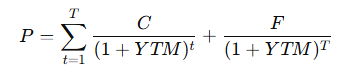여기서 P는 현재 채권가격, C는 이표채의 연간 이자 지급액, F는 액면가, T는 만기까지의 연수이다. 이 공식을 통해 알 수 있듯이, YTM은 일정한 할인율을 적용하여 현재 채권가격과 동일한 현금흐름의 현재가치 총합을 만드는 수치다. 특히 **이표채(coupon bond)**의 경우, 정기적으로 이자를 지급하기 때문에 이자 수익 외에 만기 시 원금 상환까지 고려한 YTM은 복리 수익률로 해석할 수 있다.