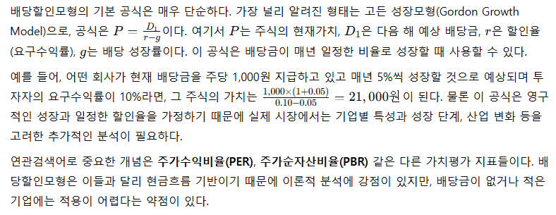 배당할인모형(Dividend Discount Model, DDM)은 주식의 가치를 평가하는 데 사용되는 대표적인 재무 모델이다. 이 모형은 주식의 현재 가치를 미래에 받을 배당금의 현재가치로 계산한다는 점에서 매우 직관적이다. 즉, 투자자가 한 주당 기대할 수 있는 미래 배당금을 할인율로 할인해 모두 더한 값이 바로 그 주식의 이론적 가치라는 것이다.